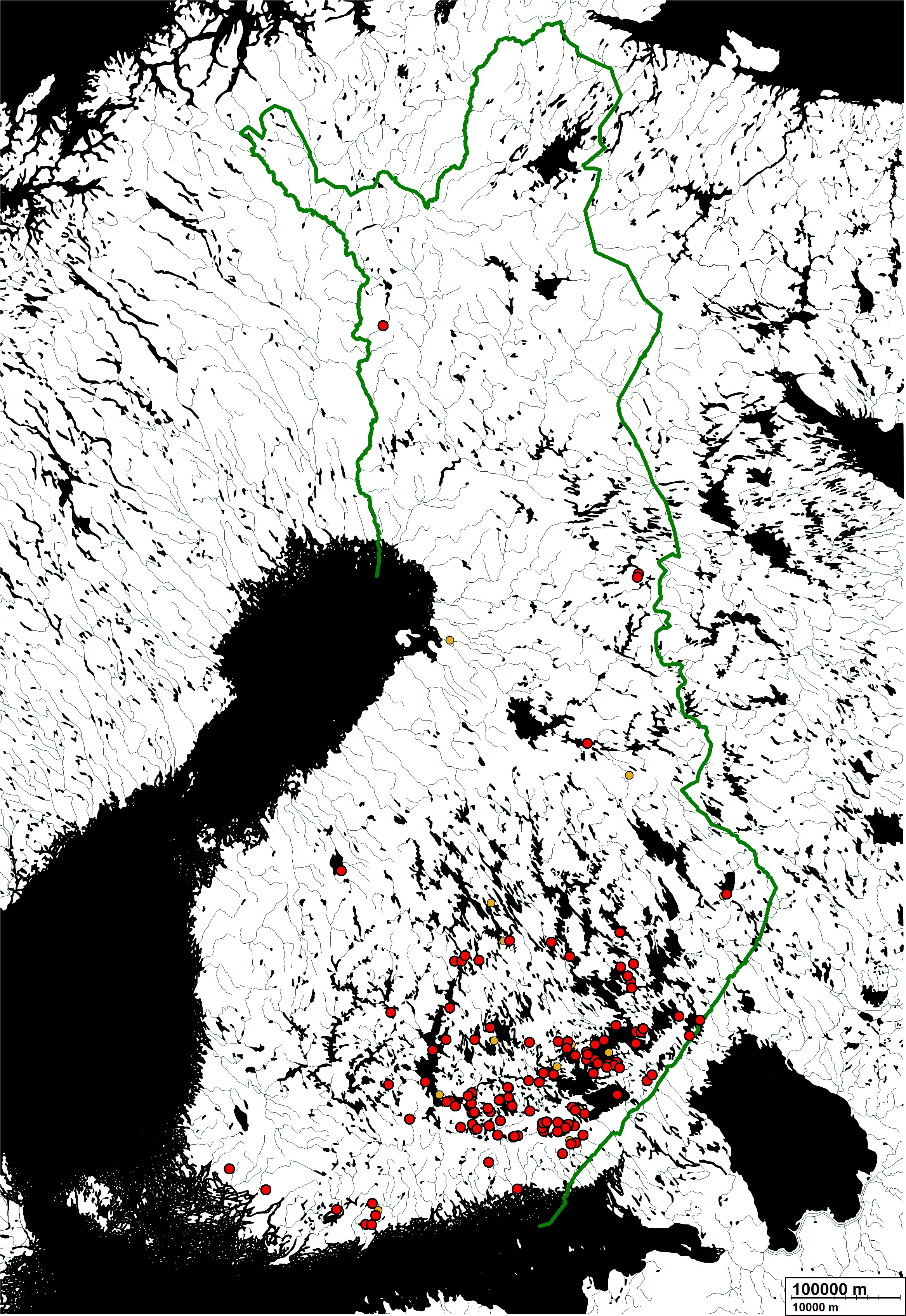 - 13 kpl kallioseinämissä ja 1 lohkareiden seinämissä, prosenttiosuudet: 93 % kallioseinämissä ja 7 % lohkareiden seinämissä